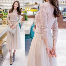 Elegant Knitted Sweater Dress Autumn Winter Dress Long Sleeve Sweater Mesh Patchwork Women Dress Office Casual Long Dress Women