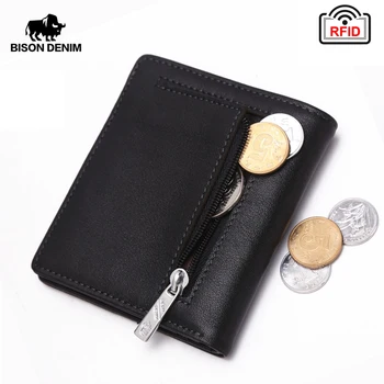 BISON DENIM Fashion Purse Men's Genuine Leather Wallet RFID Blocking Mini Wallet Male Card Holder Small Zipper Coin Purse W9317 Purses & Wallets