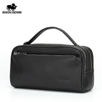 BISON DENIM Genuine Leather Men Wallet With Coin Pocket Long Double Zipper Wallet Top Handle Clutch Bag Cowskin Purse Men N8148 Purses & Wallets