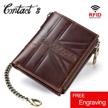 Contact's Crazy Horse Genuine Leather Wallet Men Coin Purse Walet Card Holder Portemonnee Double Zip Money Bag With Chain RFID Purses & Wallets